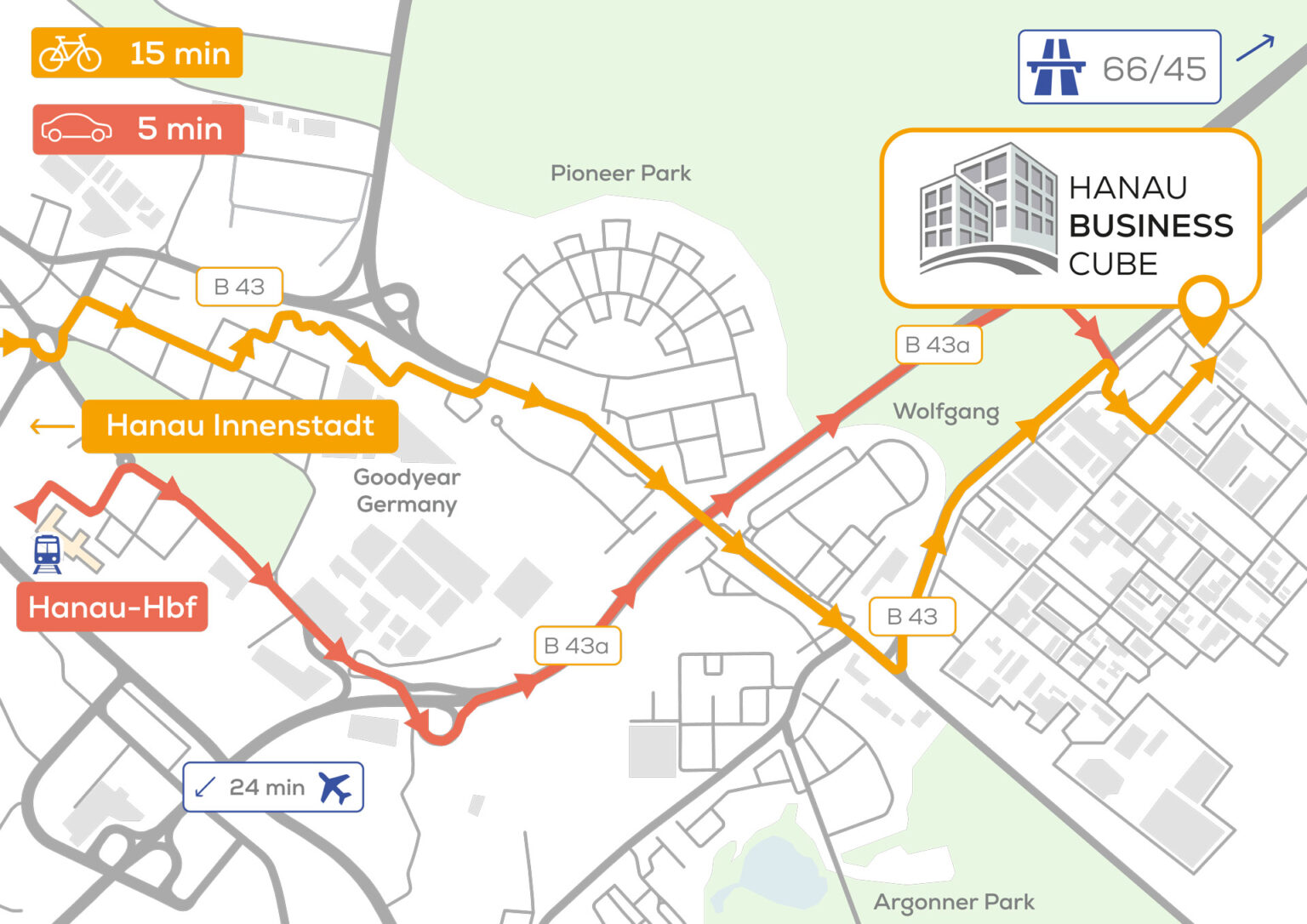 Die Lage überzeugt durch eine hervorragende Verkehrsanbindung. Innenstadt und Hauptbahnhof Hanau sind nur rund 3,5 Kilometer entfernt, die A66 befindet sich in direkter Nähe und ermöglicht eine Fahrzeit von etwa 20 Minuten zum Flughafen Frankfurt. Auch mit dem Fahrrad ist der Standort schnell erreichbar, sowohl aus der Innenstadt als auch vom Bahnhof.